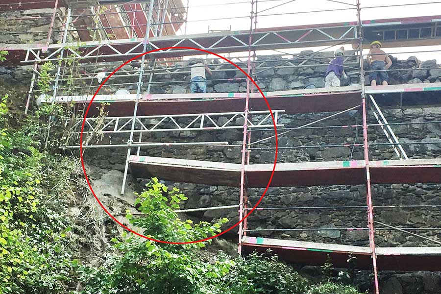 loch-erhoehte-wehrmauer-aug17 3. August 2017 • 900 × 600 • Steinmetz am Werk August 2017: Die Mauer wurde aus statischen Gründen ergänzt.