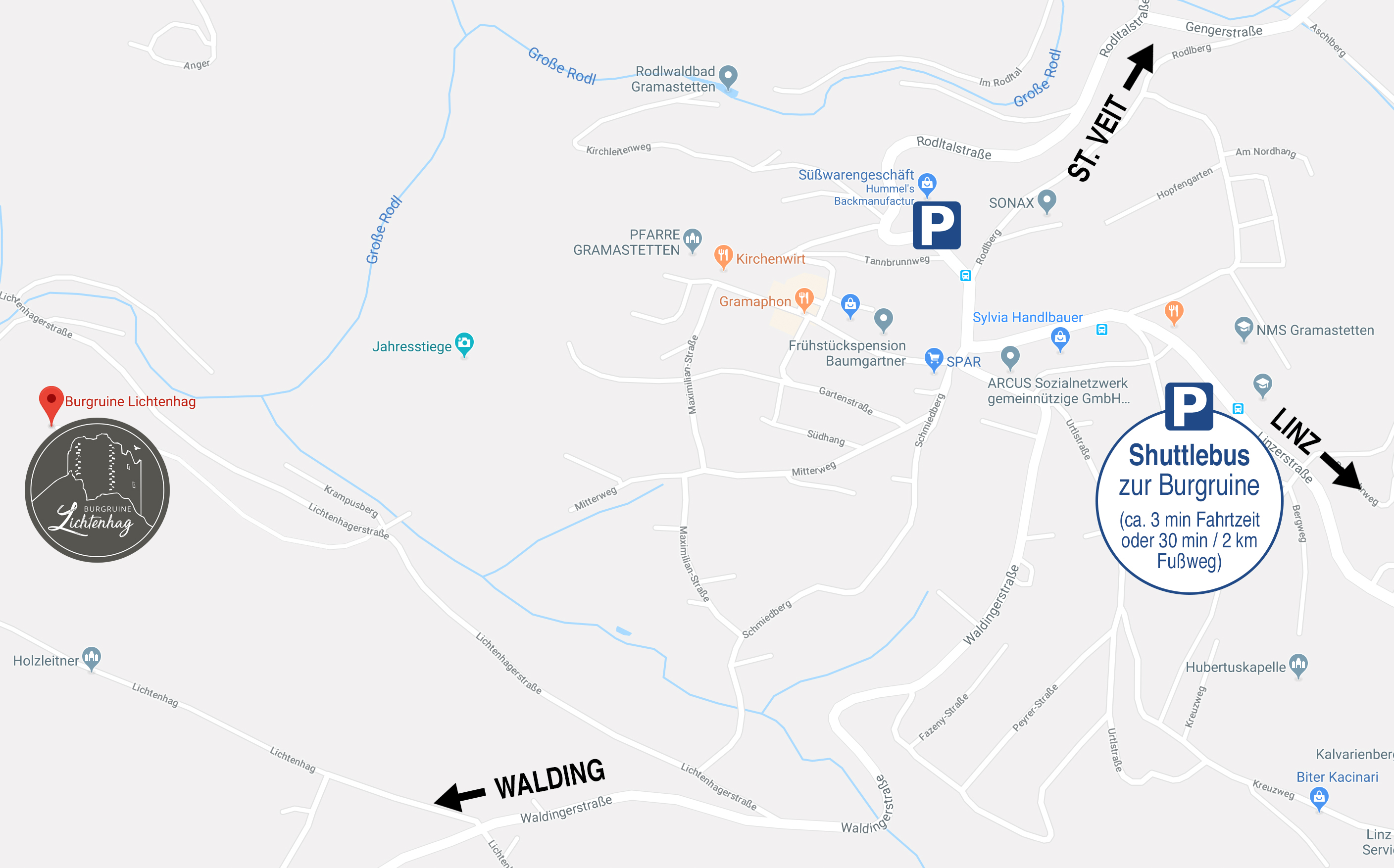 Vom Parkplatz der Neuen Mittelschule wird ein Shuttlebus eingerichtet. Dieser wird in regelmäßigen Abständen bzw. nach Bedarf die Besucher zur Ruine und wieder zurück bringen!