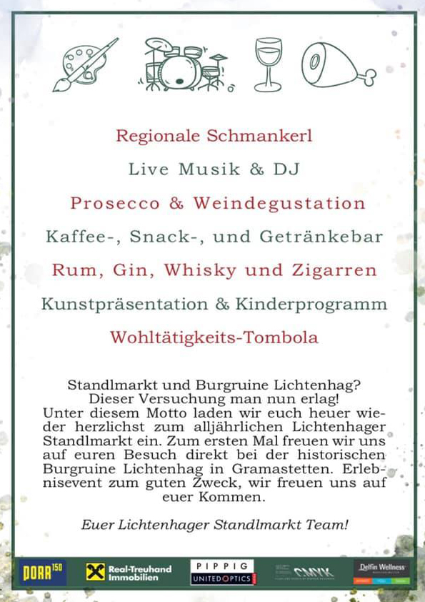 Dass der diesjährige Standlmarkt nicht wie gewohnt am Krampusberg, sondern auf der neu renovierten Ruine Lichtenhag stattfindet ist eine Besonderheit und eine Herausforderungen, was sich aber sicherlich für dieses einzigartige Ambient lohnt.