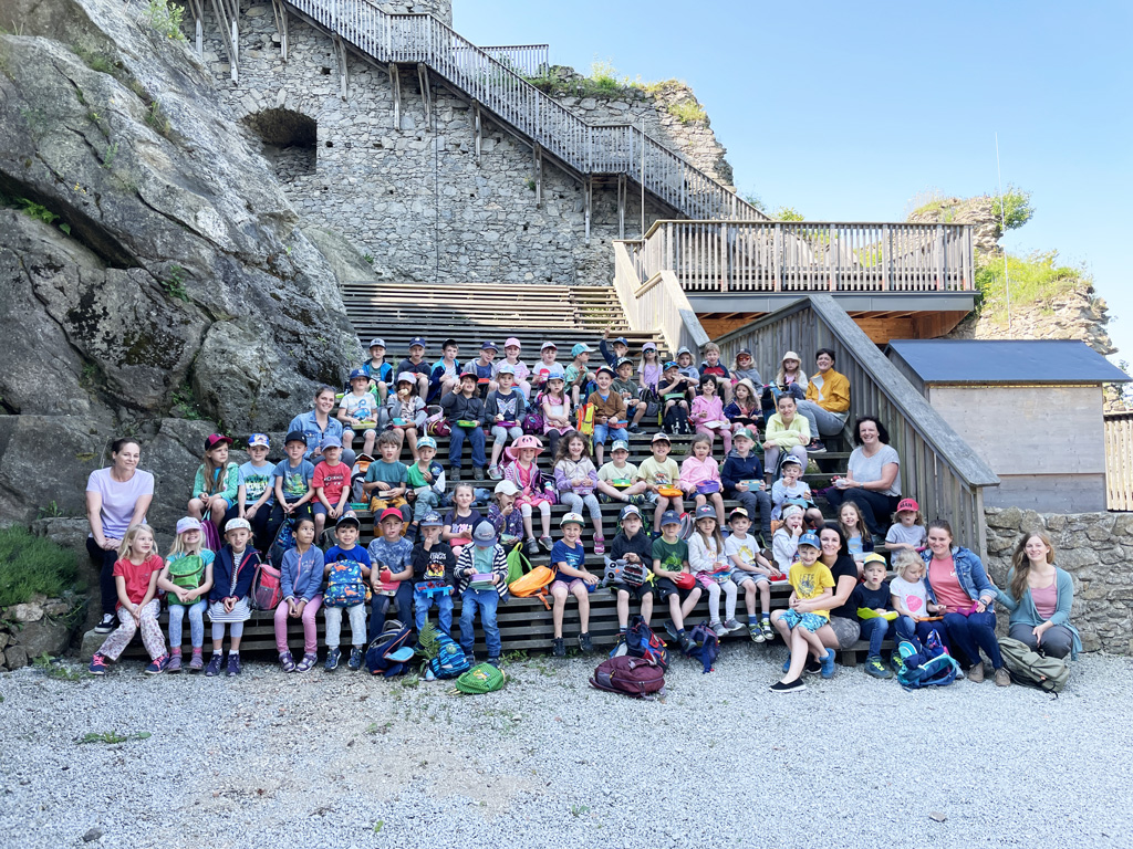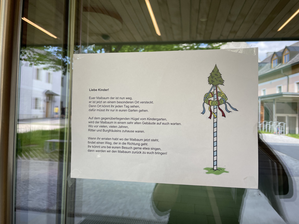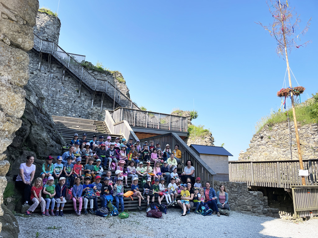 Die Kinder bekamen, wie bereits letztes Jahr, ein Rätsel auf. Sie mussten erraten, wo sich der Maibaum nun befindet. Die großen und mittleren Kinder wanderten dann am darauf folgenden Mittwoch Vormittag zur Ruine und lösten mit dem „Maibaumlied“ den Maibaum aus. Anschließend transportierte die Gemeinde den Maibaum zurück zum Kindergarten, wo mit den kleinen Kinder der Maibaum „verabschiedet“ wurde.