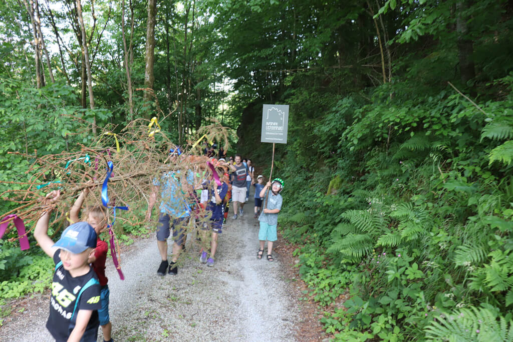 Die Wanderung führte uns dann durch die Marktstraße über den Schmiedberg zur Lichtenhagerstraße und von dort direkt zur Burgruine Lichtenhag. Der Maibaum wurde abwechselnd getragen. Begleitet von Musik und Taferlträgern sorgten wir für Aufmerksamkeit!