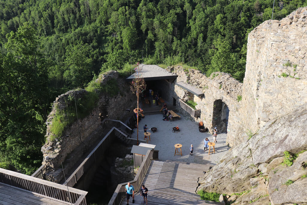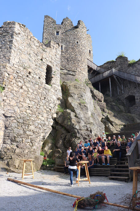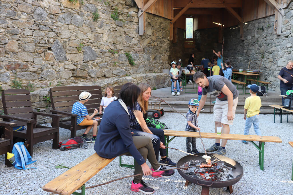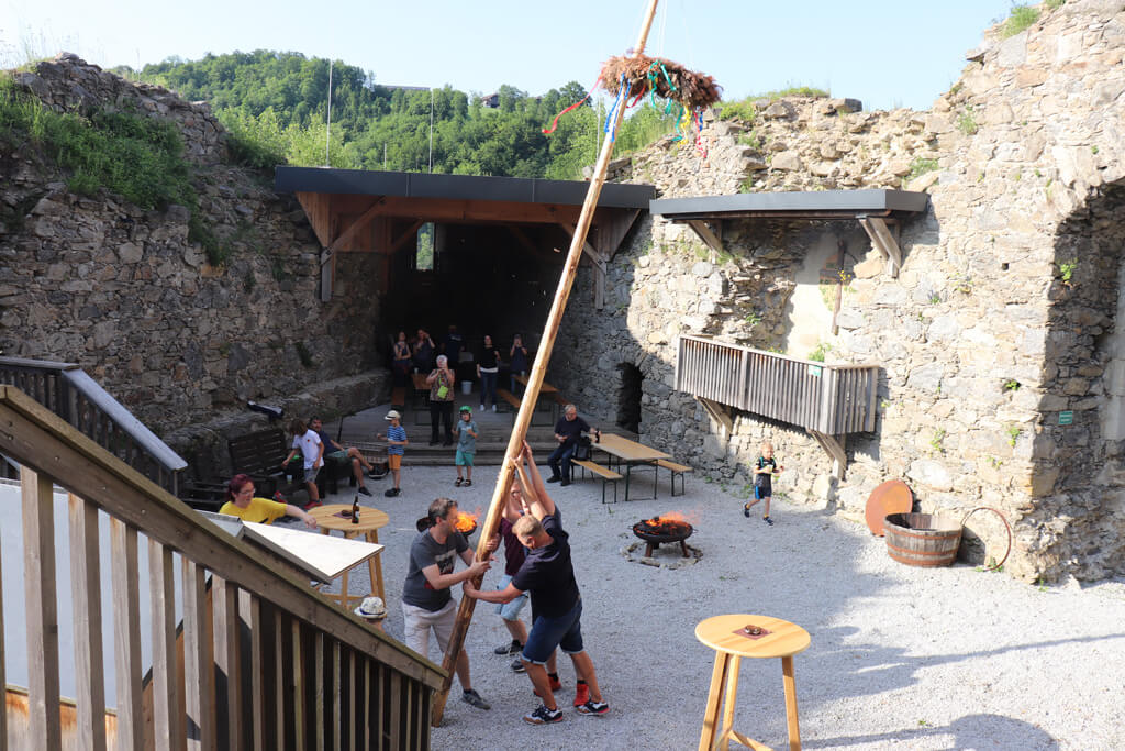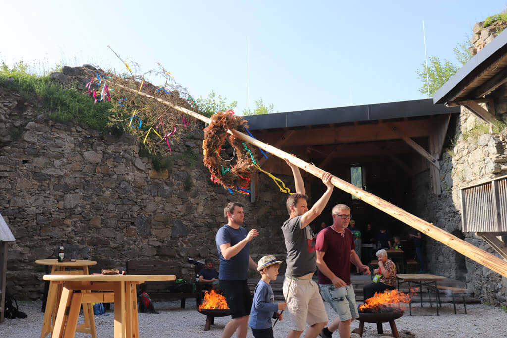 Bei der Burgruine gab es dann eine kurze Einführung zum weiteren Ablauf. Danach wurde der Maibaum im Burghof aufgestellt. Bei Kuchen (Danke an alle Bäckerinnen!), Stockbrot und Knacker ließen wir den Abend gemütlich ausklingen.
