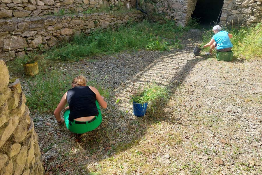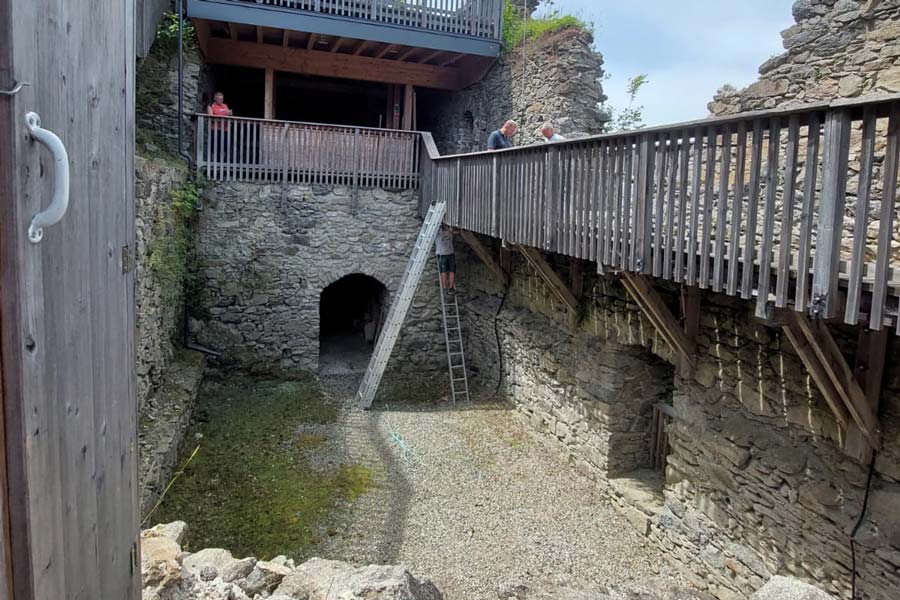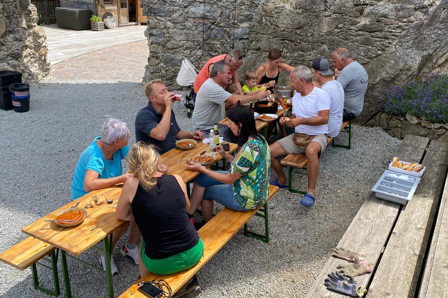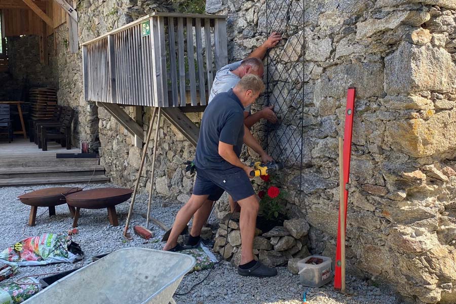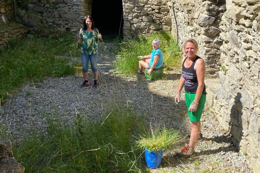 Die Arbeit der letzten Jahre hat sich gelohnt, denn das Unkrautjäten beschränkt sich jetzt auf wenige Stunden – im Frühjahr und im Herbst. An diesem Tag hatte das noch einen weiteren Vorteil, denn es war sehr heiß. Am Vormittag nutzten wir noch die kühlen Stunden und den Schatten im Burghof. Und so wurde fleißig gezupft, die Ausschank im Burghof bereits für das Konzert von Johnny Cash im September vorbereitet und die Holzbretter kontrolliert und für den bevorstehenden Austausch entsprechend markiert.