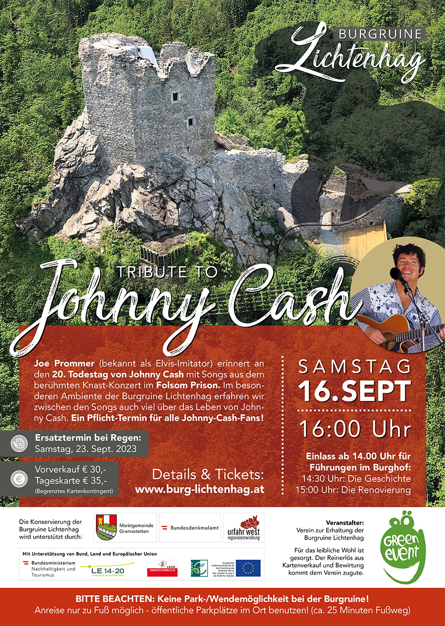 Am Nachmittag des 16. Septembers versammelten sich 163 begeisterte Besucher in der malerischen Kulisse der Burgruine Lichtenhag, um dem einzigartigen Tribute-Konzert für Johnny Cash beizuwohnen. Joe Prommer, der als renommierter Elvis-Imitator bekannt ist, gestaltete den Nachmittag als eindrucksvolle Hommage an den legendären Country-Musiker anlässlich seines 20. Todestages, der sich am 12. September jährte.
