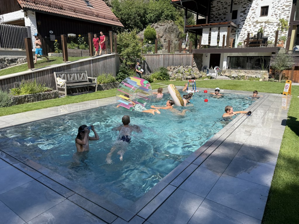 Ein großartiger Abschluss an diesem heißen Tag war die Abkühlung im Pool. Mit Eis, Knacker und Stockbrot am Lagerfeuer wurde der Vormittag abgerundet und die jungen Besucher für die Heimreise gestärkt.