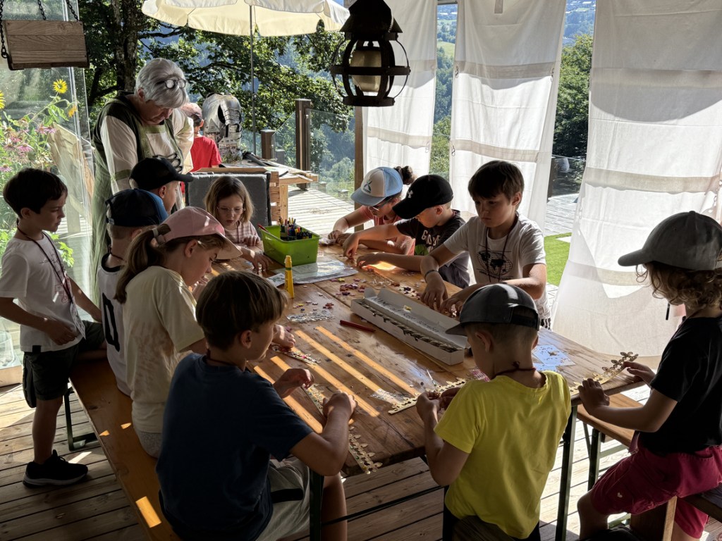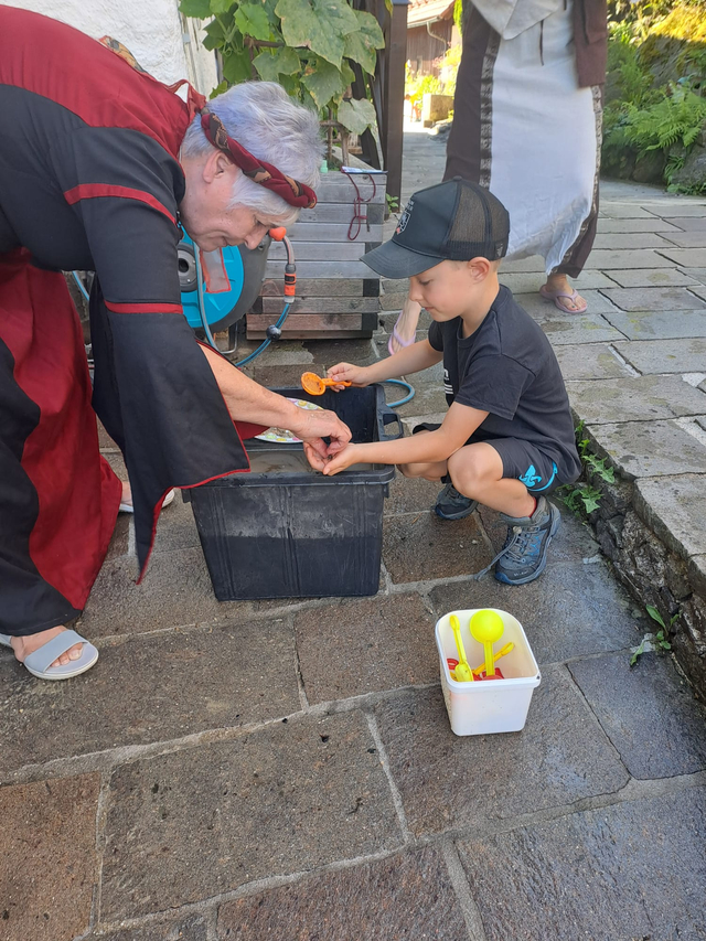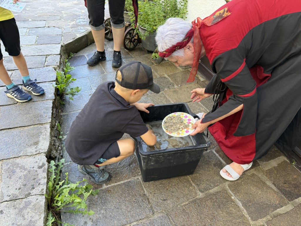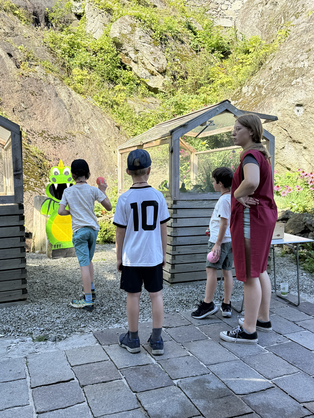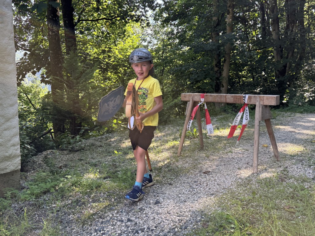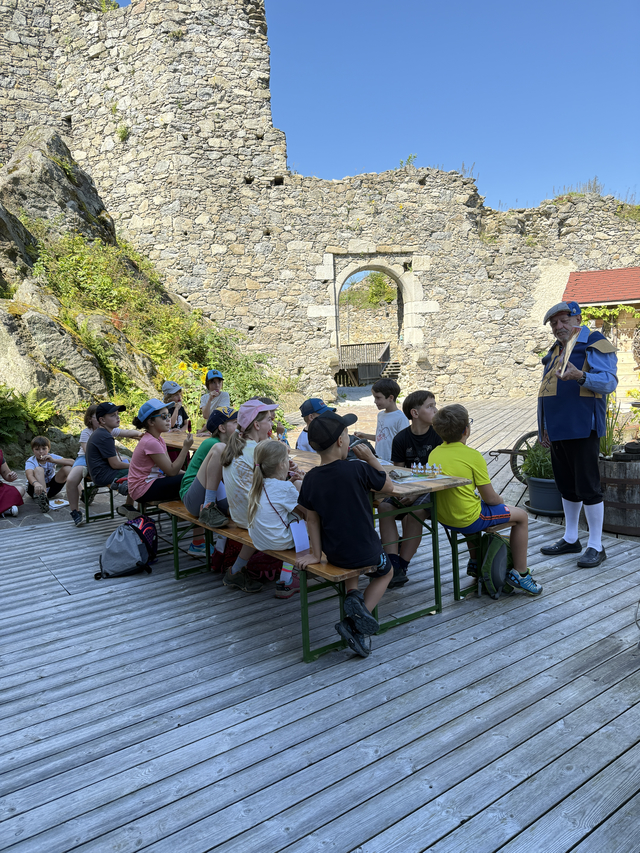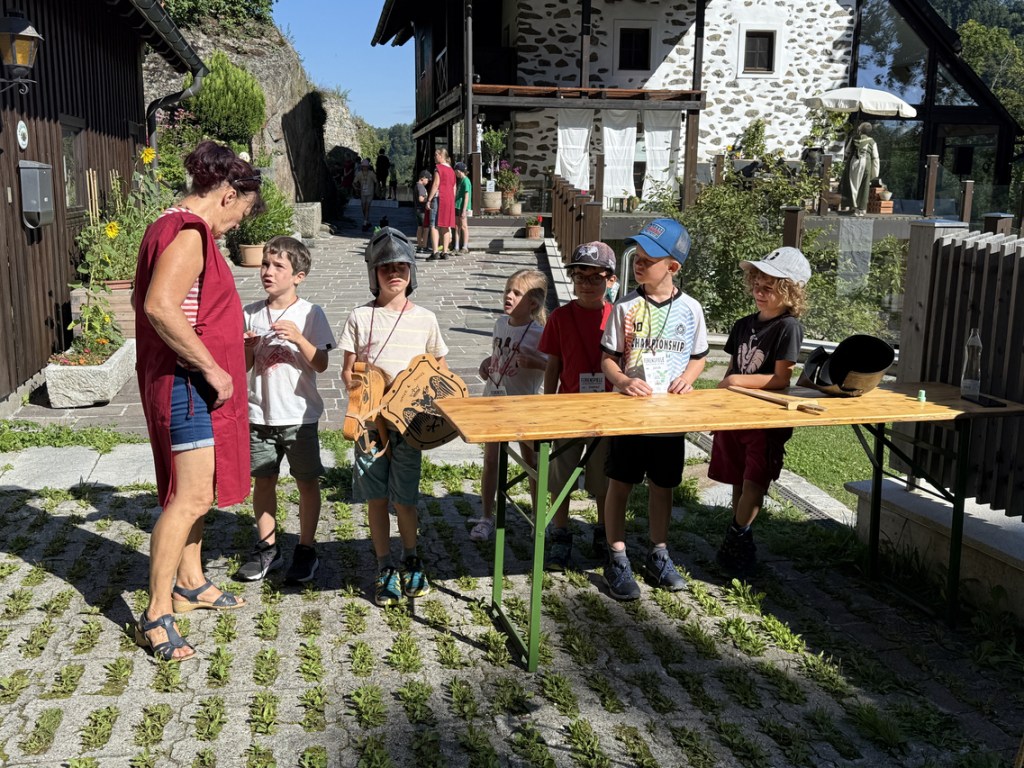 Nach einer kurzen Einführung in das Programm und die verschiedenen Stationen ging es auch schon los. Es gab viele Aufgaben zu meistern: Parkourreiten, Kronen verzieren, Gold schürfen, Schwertlauf sowie unseren Drachen Fridolin füttern. Ein besonderes Highlight waren die Geschichten von Nachtwächter Herbert Ginterseder, der die Kinder in die längst vergessenen Sagen und Gschichten rund um die Burgruine eintauchen ließ.