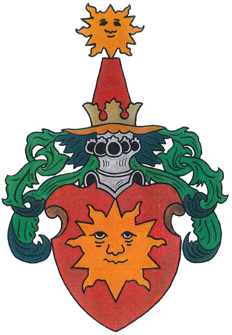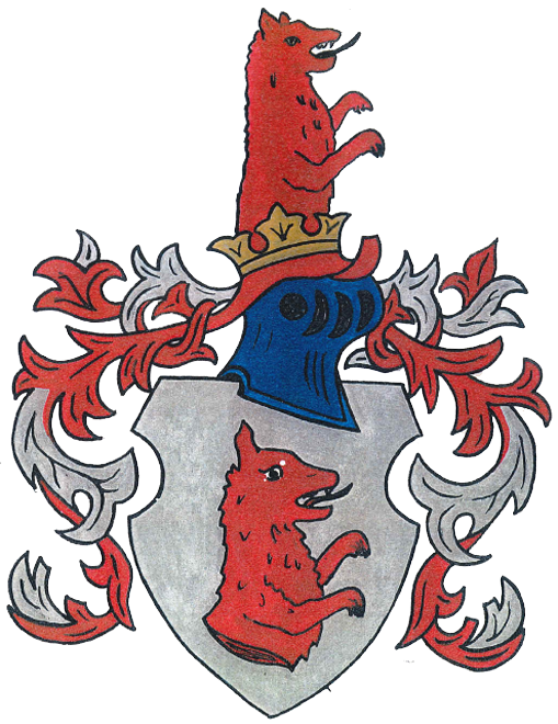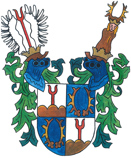 Auf ersterzehlten Schild stehen zwey offene gecrönte Thurnier-Helme, und zwar auf deren Ersteren (welcher mit einer in roth und Silber-vermischten Helm-Decken umbgeben) eine mit dem Sachsen einwärts gekehrte oben rothe und unten blaue Adlers-Flüg, über dessen Mitte die in dem Schild beschribene Gehäng-Weiß abwärts gehende-, und zu dem Aspanischen vorbeschribenen Wapen-Schild gehörige Strassen erscheinet.